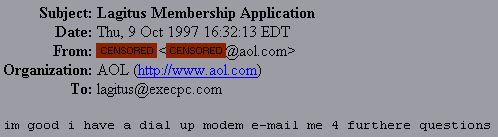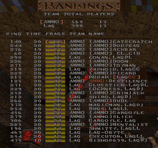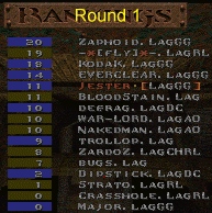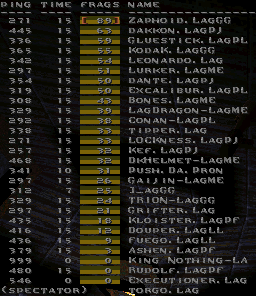 Lagitus once claimed the title of the world's largest clan with over 200 members, every one a modem player. The original requirements to get in the clan were simple. You had to play on a modem, and all you had to do was ask nicely and you were in the clan. Eventually our requirements shifted to maturity and good sportsmanship... some people got kicked out and some left before we had the chance to kick them. Then we had to actually have a membership app, designed to weed out the idiots. Heh, this app remains on display on the Membership page. It's a classic. At one point we were getting up to 10 apps a day, with most getting rejected. To this day we've had about 800 applications.