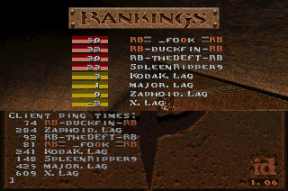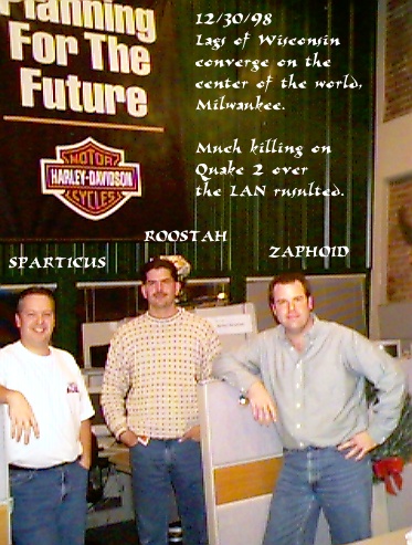 Eventually we got down to the last and final members, which are some of the coolest, most mature and most fun guys around. As the years went by, the interest level went down. No game ever matched the quality and playability of Quakeworld, not even close. Meanwhile the diversification of many new multiplayer games divided the clan further. Seems like everyone had their favorite. QW, QWRA, QWTF, Q2DM, Q2CTF, Q2RA, Sin, Half-life, Heretic 2, TFC, Tribes ... it goes on and on. That's just the 3D shooters. We had members getting involved in RPGs and other types of games. Even a huge clan can be drasticly divided by it's choice of games. Here's a word to the wise: Focus. A clan should play only one game or risk being divied into non-existence. We learned this the hard way.